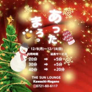 さて、12/8(月)~12/14(日)までの期間は延長サービスを開催いたします。 必ず受付で「ホームページ見たよ!」とお伝えくださいね!